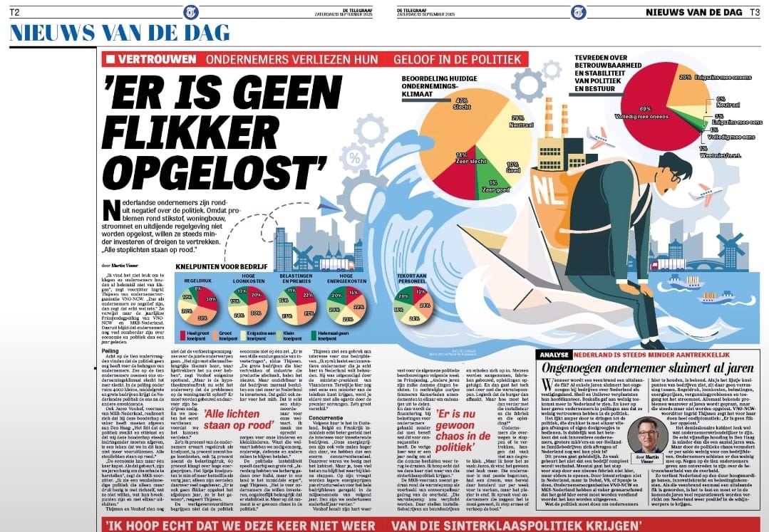 Uit de jaarlijkse Prinsjesdag Peiling van VNO-NCW en MKB-Nederland, uitgevoerd door KiesKompas, blijkt dat ondernemers massaal het vertrouwen kwijt zijn in politiek en bestuur. Bijna 90 procent is ontevreden over de stabiliteit en betrouwbaarheid en 80 procent vindt dat de politiek onvoldoende oog voor hen heeft. Volgens de ondernemersorganisaties is de politieke chaos funest voor het investeringsklimaat.
